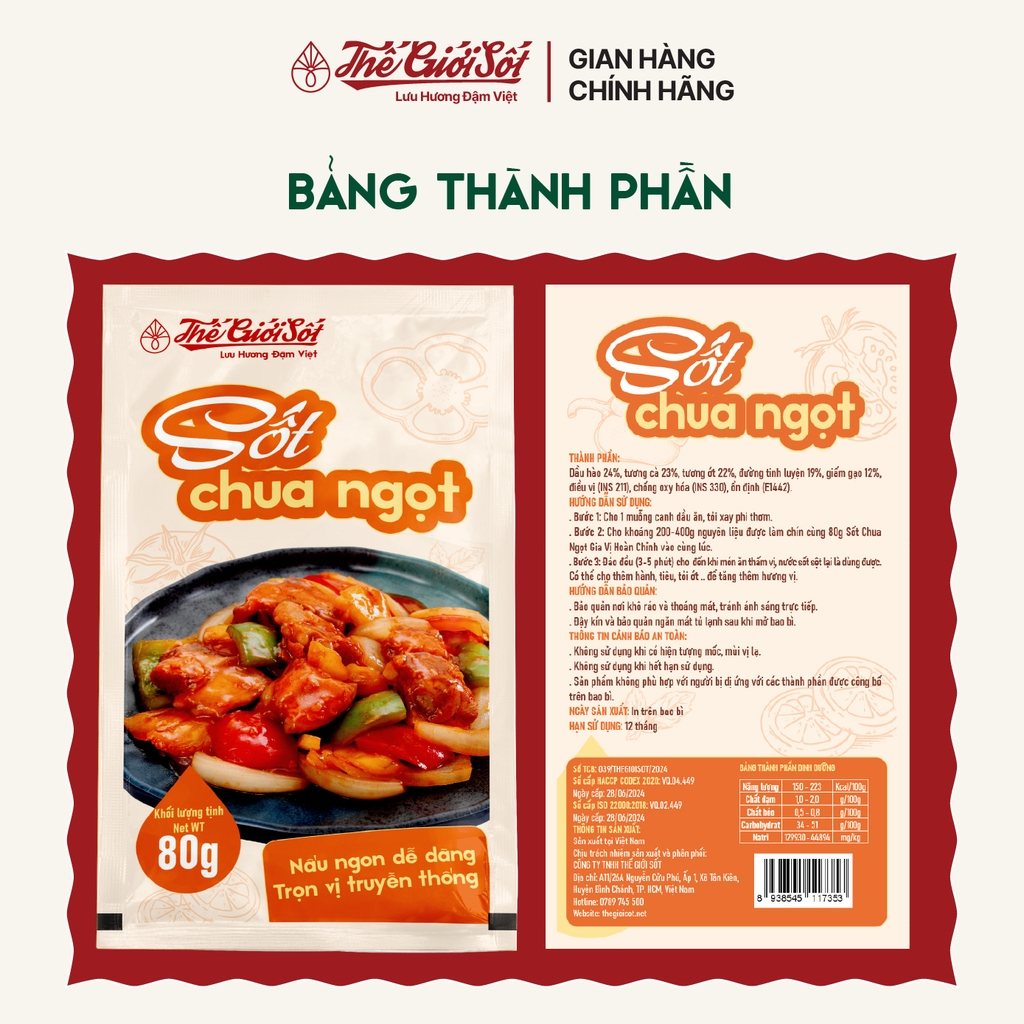 Sốt chua ngọt gói 80 gram từ Thế Giới Sốt giúp bạn dễ dàng chế biến các món ăn hấp dẫn với hương vị chua ngọt hài hòa. Chỉ với một gói sốt tiện lợi, bạn có thể tạo ra những món xào, chiên, hoặc nhúng lẩu thơm ngon, chuẩn vị truyền thống ngay tại nhà. Sản phẩm giúp tiết kiệm thời gian nấu nướng, mang đến bữa ăn ngon miệng cho cả gia đình.