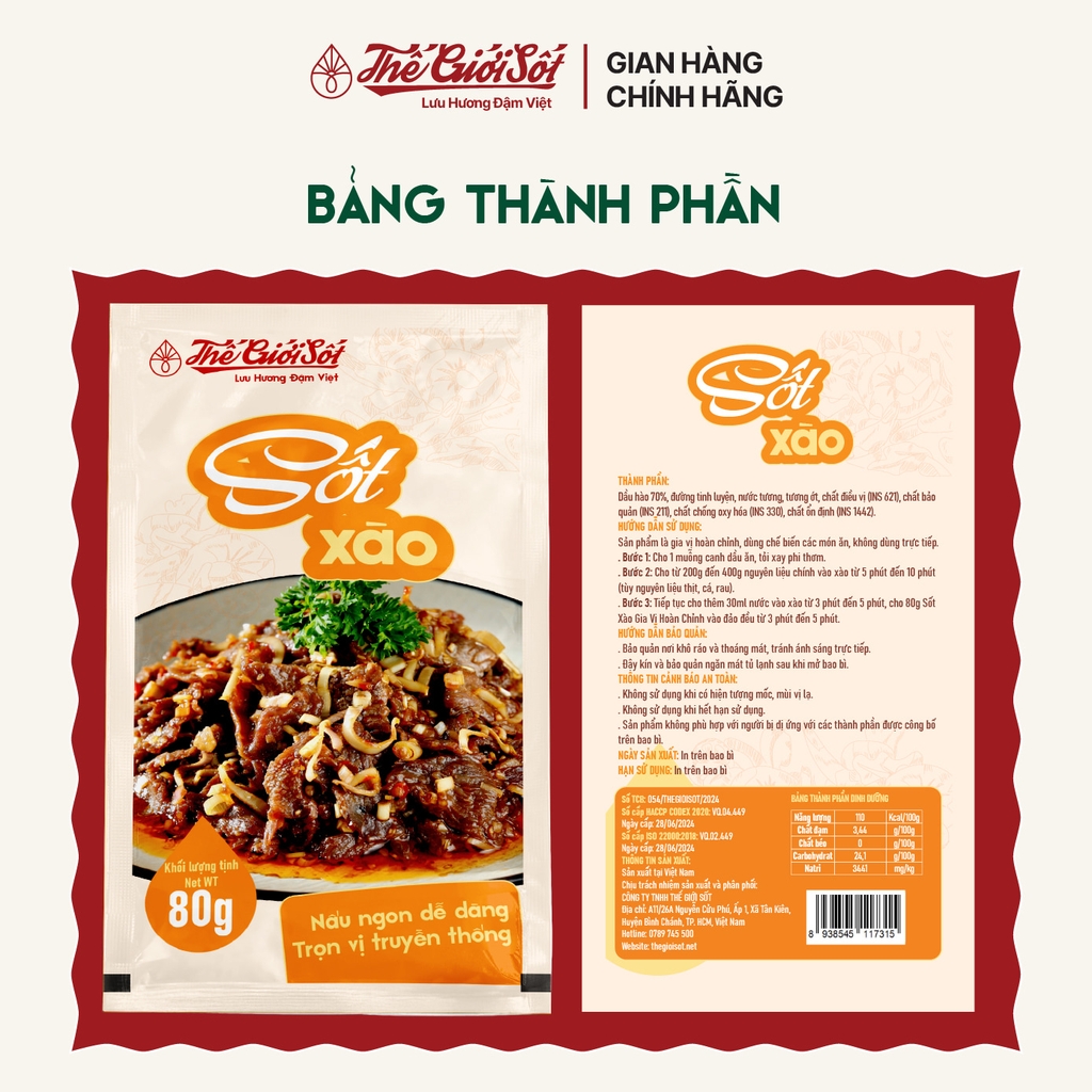 Sốt xào gói 80 gram từ Thế Giới Sốt là trợ thủ đắc lực cho các bà nội trợ bận rộn. Với gói sốt tiện lợi này, bạn có thể dễ dàng chế biến các món xào thơm ngon, chuẩn vị chỉ trong vòng 5 phút. Sản phẩm được chế biến theo công thức bếp trưởng, mang đến hương vị truyền thống đậm đà, giúp bữa ăn gia đình thêm phong phú và hấp dẫn.